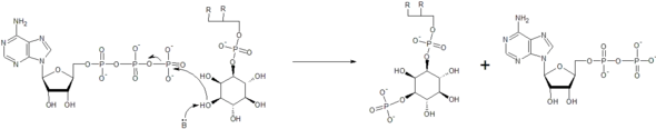 The kinase enzymes increase the rate of the reactions by making the inositol hydroxyl group more nucleophilic, often using the side chain of an amino acid residue to act as a general base and deprotonate the hydroxyl, as seen in the mechanism below.[23] Here, a reaction between adenosine triphosphate (ATP) and phosphatidylinositol is coordinated. The end result is a phosphatidylinositol-3-phosphate as well as adenosine diphosphate (ADP). The enzymes can also help to properly orient the ATP molecule, as well as the inositol group, to make the reaction proceed faster. Metal ions are often coordinated for this purpose.[23]
