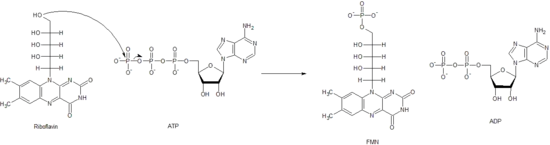 Riboflavin kinase catalyzes the phosphorylation of riboflavin to create flavin mononucleotide(FMN). It has an ordered binding mechanism where riboflavin must bind to the kinase before it binds to the ATP molecule.[30] Divalent cations help coordinate the nucleotide.[30] The general mechanism is shown in the figure below.