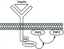 Phosphatidylinositol kinases phosphorylate phosphatidylinositol species, to create species such as phosphatidylinositol 3,4-bisphosphate (PI(3,4)P2), phosphatidylinositol 3,4,5-trisphosphate (PIP3), and phosphatidylinositol 3-phosphate (PI3P). The kinases include phosphoinositide 3-kinase (PI3K), phosphatidylinositol-4-phosphate 3-kinase, and phosphatidylinositol-4,5-bisphosphate 3-kinase. The phosphorylation state of phosphatidylinositol plays a major role in cellular signalling, such as in the insulin signalling pathway, and also has roles in endocytosis, exocytosis and other trafficking events.[20][21] Mutations in these kinases, such as PI3K, can lead to cancer or insulin resistance.[22]