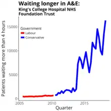 In March 2015 it had a very large backlog of patients waiting more than 18 weeks for treatment. Monitor launched an investigation into the trust because of 'long standing problems' at Princess Royal University Hospital in March 2015. Financial problems are attributed to urgent improvements to the quality of care there, including increasing the nurse-to-patient ratio by recruiting 260 new nurses.[5] In March 2018 it was the eleventh worst performer in A&E in England, with only 61.8% of patients in the main A&E seen within 4 hours.[6] In February 2019 it had 331 patients waiting more than 52 weeks for treatment, mostly in orthopaedics and bariatric surgery, twice as many as any other trust in England. It plans to outsource some of the bariatric work to Princess Grace Hospital, run by HCA Healthcare and some to Chelsea and Westminster Hospital NHS Foundation Trust.[7]