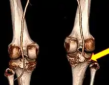 About half of cases are the result of major trauma and about half occur as a result of minor trauma.[3] In about half of cases the joint reduces itself before a person arrives at the hospital.[3] Typically there is a break of the anterior cruciate ligament, posterior cruciate ligament, and either the medial collateral ligament or lateral collateral ligament.[3] If the ankle–brachial pressure index is less than 0.9, CT angiography is recommended to detect blood vessel injury.[3] Otherwise repeated physical exams may be sufficient.[2]