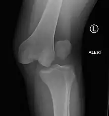 | Plain lateral X-ray of the left knee showing a posterior knee dislocation[1] | |