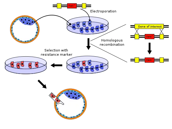 3. The new sequence from step 1 is introduced into the stem cells from step 2 by electroporation. By the natural process of homologous recombination some of the electroporated stem cells will incorporate the new sequence with the knocked-out gene into their chromosomes in place of the original gene. The chances of a successful recombination event are relatively low, so the majority of altered cells will have the new sequence in only one of the two relevant chromosomes – they are said to be heterozygous. Cells that were transformed with a vector containing the neomycin resistance gene and the herpes tk+ gene are grown in a solution containing neomycin and Ganciclovir in order to select for the transformations that occurred via homologous recombination. Any insertion of DNA that occurred via random insertion will die because they test positive for both the neomycin resistance gene and the herpes tk+ gene, whose gene product reacts with Ganciclovir to produce a deadly toxin. Moreover, cells that do not integrate any of the genetic material test negative for both genes and therefore die as a result of poisoning with neomycin.