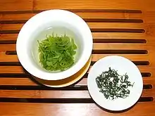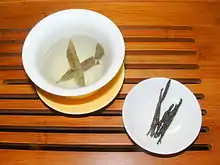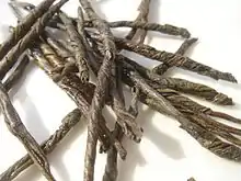 Kuding or kuzding (Chinese: 苦丁茶; pinyin: kǔdīng chá; lit. 'bitter nail tea'; pronounced [kʰù.tíŋ ʈʂʰǎ]) is a particularly bitter-tasting Chinese infusion, which due to their similarities in appearance is derived from several plant species.[1] The two most common plants used to make kuding are the wax tree species Ligustrum robustum and the holly species Ilex kaushue (synonym: Ilex kudingcha), the former being more commonly grown in Sichuan and Japan while the latter is most commonly grown and used in the rest of China.[2] Tea produced from Ligustrum or Ilex is caffeine-free. [3][4][5]