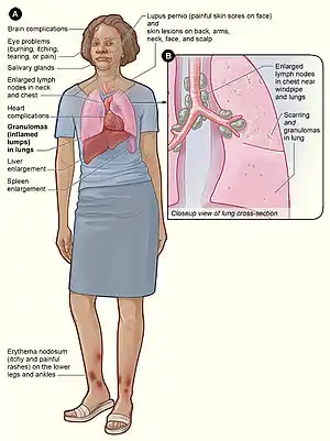 It is characterized by enlargement of the lymph nodes near the inner border of the lungs (called "hilar lymphadenopathy") as seen on x-ray, and tender red nodules (erythema nodosum) are classically present on the shins, predominantly in women. It may also be accompanied by arthritis (more prominent in men) and fever. The arthritis is often acute and involves the lower extremities.[2]