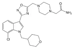 - Ratcliffe P, Adam JM, Baker J, Bursi R, Campbell R, Clark JK, et al. (April 2011). "Design, synthesis and structure-activity relationships of (indo-3-yl) heterocyclic derivatives as agonists of the CB1 receptor. Discovery of a clinical candidate". Bioorganic & Medicinal Chemistry Letters. 21 (8): 2541–6. doi:10.1016/j.bmcl.2011.02.023. PMID 21411321.