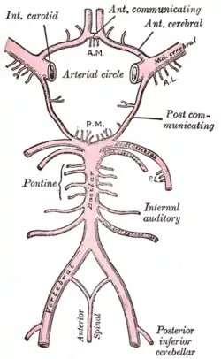 ![]() Diagram of the arterial circulation at the base of the brain. (Internal auditory artery labeled at center right.) | |
