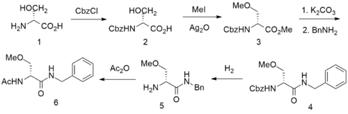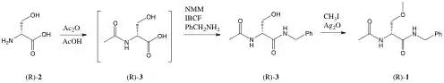 (R)-2-amino-3-hydroxypropanoic acid is treated with acetic anhydride and acetic acid. The product is treated first with N-methylmorpholine, isobutyl chloroformate, and benzylamine, next with methyl iodide and silver oxide, forming lacosamide.[36]