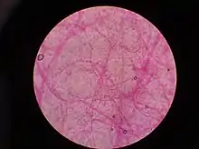 A Lactofuchsin mount (also spelled Lacto-fuchsin or Lacto-Fuchsin) is a technique used for mounting fungi with hyphae on a microscope slide for examination.[1] The main advantage of a lactofuchsin mount is that if performed correctly, it preserves the structure and arrangement of the hyphae, if present.