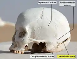 The lambdoid suture (or lambdoidal suture) is a dense, fibrous connective tissue joint on the posterior aspect of the skull that connects the parietal bones with the occipital bone. It is continuous with the occipitomastoid suture.