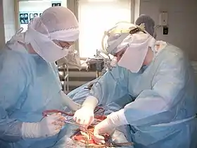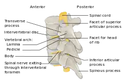 A laminotomy is an orthopaedic neurosurgical procedure that removes part of the lamina of a vertebral arch in order to relieve pressure in the vertebral canal.[1] A laminotomy is less invasive than conventional vertebral column surgery techniques, such as laminectomy because it leaves more ligaments and muscles attached to the vertebral column intact and it requires removing less bone from the vertebra.[1] As a result, laminotomies typically have a faster recovery time and result in fewer postoperative complications. Nevertheless, possible risks can occur during or after the procedure like infection, hematomas, and dural tears.[2] Laminotomies are commonly performed as treatment for lumbar spinal stenosis and herniated disks.[2] MRI and CT scans are often used pre- and post surgery to determine if the procedure was successful.[2]