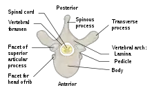 The vertebral arch is composed of several anatomical features in addition to laminae that must be taken into account when performing a laminotomy. In the center of the vertebral arch is a bony projection called the spinous process.[3] The spinous process is located on the posterior or back side of the vertebra and serves as the attachment point for ligaments and muscles which support and stabilize the vertebral column.[3] Each vertebra has two lateral bony projections called the transverse processes which are located on either side of the vertebral arch. Transverse processes come into contact with the ribs and serve as attachment points for muscles and ligaments that stabilize the vertebral column.[3] The lamina is the segment of bone that connects the spinous process to the transverse process. Each vertebra has two lamina, one on each side of the spinous process.[3]