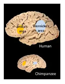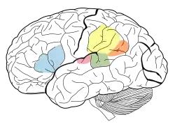 In neuroscience and psychology, the term language center refers collectively to the areas of the brain which serve a particular function for speech processing and production.[1] Language is a core system, which gives humans the capacity to solve difficult problems and provides them with a unique type of social interaction.[2] Language allows individuals to attribute symbols (e.g. words or signs) to specific concepts and display them through sentences and phrases that follow proper grammatical rules.[2] Moreover, speech is the mechanism in which language is orally expressed.[2]