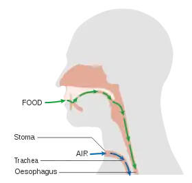 Laryngectomy is the removal of the larynx and separation of the airway from the mouth, nose and esophagus. In a total laryngectomy, the entire larynx is removed (including the vocal folds, hyoid bone, epiglottis, thyroid and cricoid cartilage and a few tracheal cartilage rings).[1] In a partial laryngectomy, only a portion of the larynx is removed. Following the procedure, the person breathes through an opening in the neck known as a stoma.[2] This procedure is usually performed by an ENT surgeon in cases of laryngeal cancer. Many cases of laryngeal cancer are treated with more conservative methods (surgeries through the mouth, radiation and/or chemotherapy). A laryngectomy is performed when these treatments fail to conserve the larynx or when the cancer has progressed such that normal functioning would be prevented. Laryngectomies are also performed on individuals with other types of head and neck cancer.[3] Post-laryngectomy rehabilitation includes voice restoration, oral feeding and more recently, smell and taste rehabilitation. An individual's quality of life can be affected post-surgery.[1]