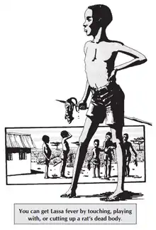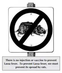 The disease is usually initially spread to people via contact with the urine or feces of an infected multimammate mouse.[1] Spread can then occur via direct contact between people.[1] Diagnosis based on symptoms is difficult.[1] Confirmation is by laboratory testing to detect the virus's RNA, antibodies for the virus, or the virus itself in cell culture.[1] Other conditions that may present similarly include Ebola, malaria, typhoid fever, and yellow fever.[1] The Lassa virus is a member of the Arenaviridae family of viruses.[1]