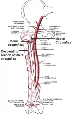 ![]() The profunda femoris artery, femoral artery and their major branches - right thigh, anterior view. Circumflex femoral arteries labeled. | |