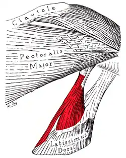 A fibrous slip usually passes from the upper border of the tendon of the Latissimus dorsi, near its insertion, to the long head of the triceps brachii. This is occasionally muscular, and is the representative of the dorsoepitrochlearis brachii of apes.[3][4] This muscular form is found in ~5% of humans and is sometimes termed the latissimocondyloideus.[5]
