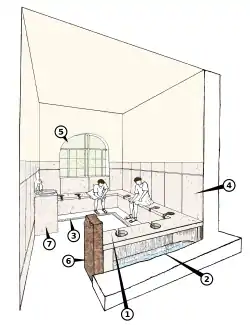 The word "latrine" is derived from the Latin lavatrina, meaning bath. Today it is commonly used in the term "pit latrine". It has the connotation of something being less advanced and less hygienic than a standard toilet . It is typically used to describe communal facilities, such as the shallow-trench latrines used in emergency sanitation situations, e.g. after an earthquake, flood or other natural disaster.