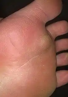 Plantar fascial fibromatosis, also known as Ledderhose's disease, Morbus Ledderhose, and plantar fibromatosis, is a relatively uncommon[2] non-malignant thickening of the feet's deep connective tissue, or fascia. In the beginning, where nodules start growing in the fascia of the foot the disease is minor . Over time walking becomes painful. The disease is named after Dr. Georg Ledderhose, a German surgeon who described the condition for the first time in 1894.[3][4] A similar disease is Dupuytren's disease, which affects the hand and causes bent hand or fingers.