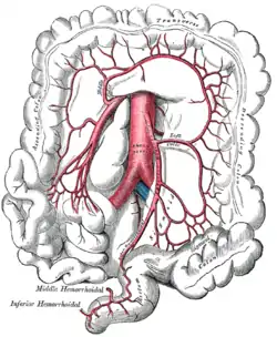 ![]() Sigmoid colon and rectum, showing distribution of branches of inferior mesenteric artery and their anastomoses. (Left colic visible at center left.) | |