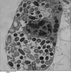 In humans, L. pneumophila invades and replicates inside macrophages. The internalization of the bacteria can be enhanced by the presence of antibody and complement, but is not absolutely required. Internalization of the bacteria appears to occur through phagocytosis. However, L. pneumophila is also capable of infecting non-phagocytic cells through an unknown mechanism. A rare form of phagocytosis known as coiling phagocytosis has been described for L. pneumophila, but this is not dependent on the Dot/Icm (intracellular multiplication/defect in organelle trafficking genes) bacterial secretion system and has been observed for other pathogens.[9] Once internalized, the bacteria surround themselves in a membrane-bound vacuole that does not fuse with lysosomes that would otherwise degrade the bacteria. In this protected compartment, the bacteria multiply.