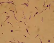 Leishmania major is a species of parasites found in the genus Leishmania, and is associated with the disease zoonotic cutaneous leishmaniasis (also known as Aleppo boil, Baghdad boil, Bay sore, Biskra button, Chiclero ulcer, Delhi boil, Kandahar sore, Lahore sore, Oriental sore, Pian bois, and Uta).[1] L. major is an intracellular pathogen which infects the macrophages and dendritic cells of the immune system.[2] Though Leishmania species are found on every continent aside from Antarctica, Leishmania major is found only in the Eastern Hemisphere, specifically in Northern Africa,[3] the Middle East, Northwestern China, and Northwestern India.[4][5]