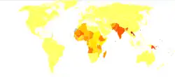Out of 200 countries and territories reporting to WHO, 97 countries and territories are endemic for leishmaniasis.[23] The settings in which leishmaniasis is found range from rainforests in Central and South America to deserts in western Asia and the Middle East. It affects as many as 12 million people worldwide, with 1.5–2.0 million new cases each year.[24] The visceral form of leishmaniasis has an estimated incidence of 500,000 new cases.[25] In 2014, more than 90% of new cases reported to WHO occurred in six countries: Brazil, Ethiopia, India, Somalia, South Sudan and Sudan.[26] As of 2010, it caused about 52,000 deaths, down from 87,000 in 1990.[10] Different types of the disease occur in different regions of the world.[2] Cutaneous disease is most common in Afghanistan, Algeria, Brazil, Colombia, and Iran, while mucocutaneous disease is most common in Bolivia, Brazil, and Peru, and visceral disease is most common in Bangladesh, Brazil, Ethiopia, India, and Sudan.[2]