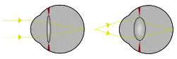 ![]() Light from a single point of a distant object and light from a single point of a near object being brought to a focus by changing the curvature of the lens. | |