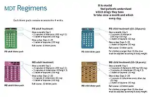Multidrug therapy (MDT) remains highly effective, and people are no longer infectious after the first monthly dose.[4] It is safe and easy to use under field conditions due to its presentation in calendar blister packs.[4] Post-treatment relapse rates remain low.[4] Resistance has been reported in several countries, although the number of cases is small.[86] People with rifampicin-resistant leprosy may be treated with second line drugs such as fluoroquinolones, minocycline, or clarithromycin, but the treatment duration is 24 months due to their lower bactericidal activity.[87] Evidence on the potential benefits and harms of alternative regimens for drug-resistant leprosy is not yet available.[10]