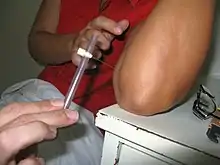 The Bacillus Calmette–Guérin (BCG) vaccine offers a variable amount of protection against leprosy in addition to its target of tuberculosis.[77] It appears to be 26% to 41% effective (based on controlled trials) and about 60% effective based on observational studies with two doses possibly working better than one.[78][79] The WHO concluded in 2018 that the BCG vaccine at birth reduces leprosy risk and is recommended in countries with high incidence of TB and people who have leprosy.[80] People living in the same home as a person with leprosy are suggested to take a BCG booster which may improve their immunity by 56%.[81][82] Development of a more effective vaccine is ongoing.[14][83][84][85]