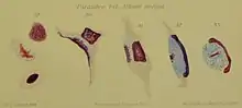 Drawing of owl blood cells parasitized by Leukocytozoen danilewskyi by Hans Ziemann in 1898