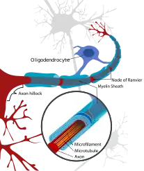 White matter consists of nerve fibers (axons) covered by a substance called myelin that insulates and protects them.[2] The axons extend from nerve cells (neurons) and transmit nerve impulses throughout the body.[2]