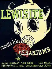 Lewisite (L) is an organoarsenic compound. It was once manufactured in the U.S., Japan, Germany[2] and the Soviet Union[3] for use as a chemical weapon, acting as a vesicant (blister agent) and lung irritant. Although colorless and odorless, impure samples of lewisite are a yellow, brown, violet-black, green, or amber oily liquid with a distinctive odor that has been described as similar to geraniums.[4][5]