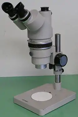 Optical or light microscopy involves passing visible light transmitted through or reflected from the sample through a single lens or multiple lenses to allow a magnified view of the sample.[11] The resulting image can be detected directly by the eye, imaged on a photographic plate, or captured digitally. The single lens with its attachments, or the system of lenses and imaging equipment, along with the appropriate lighting equipment, sample stage, and support, makes up the basic light microscope. The most recent development is the digital microscope, which uses a CCD camera to focus on the exhibit of interest. The image is shown on a computer screen, so eye-pieces are unnecessary.