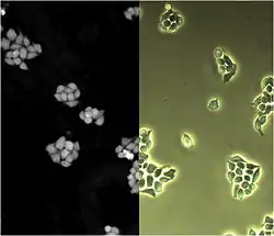 Superior and much more expensive is the use of interference contrast. Differences in optical density will show up as differences in relief. A nucleus within a cell will actually show up as a globule in the most often used differential interference contrast system according to Georges Nomarski. However, it has to be kept in mind that this is an optical effect, and the relief does not necessarily resemble the true shape. Contrast is very good and the condenser aperture can be used fully open, thereby reducing the depth of field and maximizing resolution.