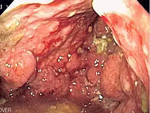 | Endoscopic image of linitis plastica, where the entire stomach is invaded with stomach cancer, leading to a leather bottle like appearance. | |