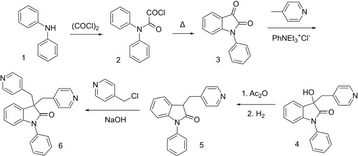 The synthesis starts with a standard scheme for preparing indoxyls. Thus, acylation of diphenylamine with oxalyl chloride leads to the amide. The acid chloride then cyclizes into the ring on heating to afford (3). Reaction of that product with 4-picoline under phase-transfer conditions catalyzed by a quaternary salt affords the carbinol (4) from addition of the transient anion on the methyl group of the picoline to the more electrophilic carbonyl group. The alcohol is then dehydrated by means of acetic anhydride and the resulting olefin hydrogenated to afford the indolone (5). The 3 position is now activated by the adjacent benzene ring on one side and the carbonyl group on the other. Alkylation with α-chloropicoline proceeds with hydroxide as the base to afford Linopirdine (6).