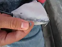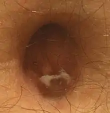 Navel lint (also known by names such as navel fluff, belly button lint, belly button fluff, and dip lint) is an accumulation of fluffy fibers in the navel cavity often found at the beginning and end of the day. Cloth fibers are scraped by body hair via friction, which ratchets the fibers in the direction of hair growth. One hypothesis is that hair travels along a lint highway defined as integral curves of the vector field given by the direction of growth of the hair, which must end at a vanishing point according to the hairy ball theorem.[6] Another is that rubbing of navel hairs and clothing contributes to a build-up of static electricity, resulting in the collection of clothing fibers and to a lesser extent, dead skin cells.