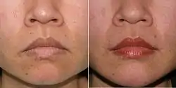 A lip lift is a plastic surgery procedure that modifies the cosmetic appearance of the lips by reshaping them to increase the prominence of the vermilion border; and to enhance the facial area above the lips into a more aesthetically pleasing shape. In corrective praxis, a lip lift procedure is distinguished from lip enhancement, the augmentation of the lips, which can be effected with a non-surgical procedure.