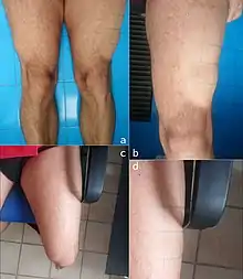 It consists of a semicircular zone of atrophy of the subcutaneous fatty tissue located mostly on the front of the thighs. Skin and underlying muscles remains intact.