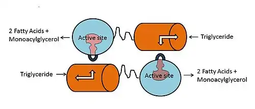 The LPL non-covalent homodimer has a head-to-tail arrangement of the monomers. The Ser/Asp/His triad is in a hydrophobic groove that is blocked from solvent by the lid.[5][11] Upon binding to ApoC-II and lipid in the lipoprotein, the C-terminal domain presents the lipid substrate to the lid region. The lipid interacts with both the lid region and the hydrophobic groove at the active site; this causes the lid to move, providing access to the active site. The β5 loop folds back into the protein core, bringing one of the electrophiles of the oxyanion hole into position for lipolysis.[5] The glycerol backbone of the lipid is then able to enter the active site and is hydrolyzed.