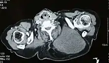 MRI of myxoid liposarcoma of high grade, in left axillary region of 40 year old man. Highlighted by the white color. Horizontal section.