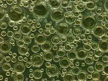Various types of phosphatidylcholine liposomes in suspension. Method of phase-contrast microscopy (1000-fold magnification). The following types of liposomes are visible: small monolamellar vesicles, large monolamellar vesicles, multilamellar vesicles, oligolamellar vesicles.