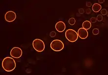 A micrograph of phosphatidylcholine liposomes, which were stained with fluorochrome acridine orange. Method of fluorescence microscopy (1250-fold magnification).