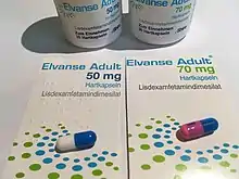 Lisdexamfetamine, sold under the brand name Vyvanse among others, is a medication that is a derivative of amphetamine. It is mainly used to treat attention deficit hyperactivity disorder (ADHD) in people over the age of five as well as moderate-to-severe binge eating disorder in adults.[10] Lisdexamfetamine is taken by mouth.[10][11] In the United Kingdom, it is usually less preferred than methylphenidate.[12] Its effects generally begin within 2 hours and last for up to 14 hours.[10]