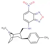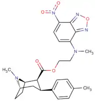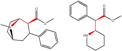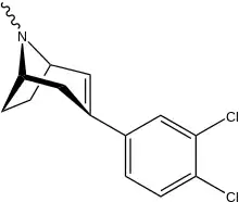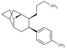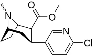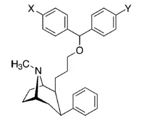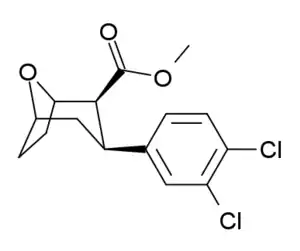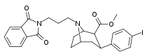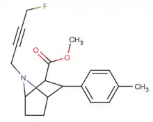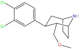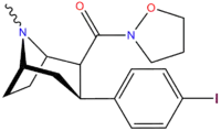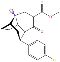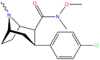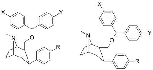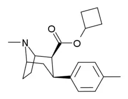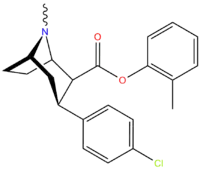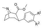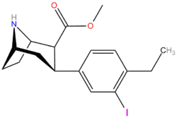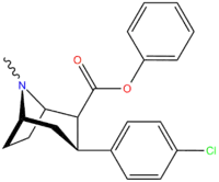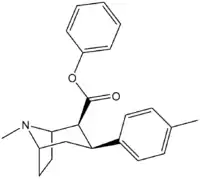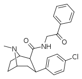 Phenyltropanes (PTs) are a family of chemical compounds originally derived from structural modification of cocaine. The main feature differentiating phenyltropanes from cocaine is that they lack the ester functionality at the 3-position terminating in the benzene; and thusly the phenyl is attached direct to the tropane skeleton with no further spacer (therefore the name "phenyl"-tropane) that the cocaine benzoyloxy provided. The original purpose of which was to extirpate the cardiotoxicity inherent in the local anesthetic "numbing" capability of cocaine (since the methylated benzoate ester is essential to cocaine's blockage of sodium channels which cause topical anesthesia) while retaining stimulant function.[lower-alpha 1] These compounds present many different avenues of research into therapeutic applications, particularly in addiction treatment. Uses vary depending on their construction and structure-activity relationship ranging from the treating of cocaine dependency to understanding the dopamine reward system in the human brain to treating Alzheimer's & Parkinson's diseases. (Since 2008 there have been continual additions to the list and enumerations of the plethora of types of chemicals that fall into the category of this substance profile.[2]) Certain phenyltropanes can even be used as a smoking cessation aid (c.f. RTI-29). Many of the compounds were first elucidated in published material by the Research Triangle Institute and are thus named with "RTI" serial-numbers (in this case the long form is either RTI-COC-n, for 'cocaine' "analog", or specifically RTI-4229-n of the subsequent numbers given below in this article)[lower-alpha 2] Similarly, a number of others are named for Sterling-Winthrop pharmaceuticals ("WIN" serial-numbers) and Wake Forest University ("WF" serial-numbers). The following includes many of the phenyltropane class of drugs that have been made and studied.