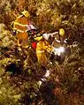 Firefighters lowering a Stokes basket down a hill
