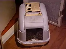 A litter box, sometimes called a sandbox, cat box, litter tray, cat pan, or litter pan, is an indoor feces and urine collection box for cats, as well as rabbits, ferrets, miniature pigs, small dogs, and other pets that instinctively or through training will make use of such a repository. They are provided for pets that are permitted free roam of a home but who cannot or do not always go outside to excrete their metabolic waste. Many owners of these animals prefer not to let them roam outside for fear that they might succumb to outdoor dangers. On average, indoor cats have a lifespan of 16.8 years while outdoor cats' lives are much shorter, only 5.6 years.[1] These outdoor dangers include weather, wildlife, traffic or diseases such as the feline immunodeficiency virus.[2]
