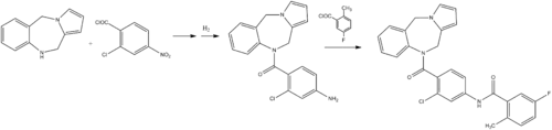 - Albright JD, Reich MF, Delos Santos EG, Dusza JP, Sum FW, Venkatesan AM, et al. (July 1998). "5-Fluoro-2-methyl-N-[4-(5H-pyrrolo[2,1-c]-[1, 4]benzodiazepin-10(11H)-ylcarbonyl)-3-chlorophenyl]benzamide (VPA-985): an orally active arginine vasopressin antagonist with selectivity for V2 receptors". Journal of Medicinal Chemistry. 41 (14): 2442–4. doi:10.1021/jm980179c. PMID 9651149.