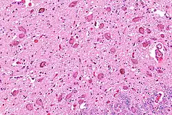 The locus ceruleus is affected in many forms of neurodegenerative diseases: genetic and idiopathic Parkinson's disease, progressive supranuclear palsy, Pick's disease or Alzheimer's disease. It is also affected in Down syndrome.[24] For example, there is up to 80% loss of locus ceruleus neurons in Alzheimer's disease.[25] Mouse models of Alzheimer's disease show accelerated progression after chemical destruction of the locus ceruleus[26] The norepinephrine from locus ceruleus cells in addition to its neurotransmitter role locally diffuses from "varicosities". As such it provides an endogenous anti-inflammatory agent in the microenvironment around the neurons, glial cells, and blood vessels in the neocortex and hippocampus.[13] It has been shown that norepinephrine stimulates mouse microglia to suppress -induced production of cytokines and promotes phagocytosis of Aβ.[13] This suggests that degeneration of the locus ceruleus might be responsible for increased Aβ deposition in AD brains.[13] Degeneration of pigmented neurons in this region in Alzheimer's and Parkinson's disease can be visualized in vivo with Neuromelanin MRI.[27]